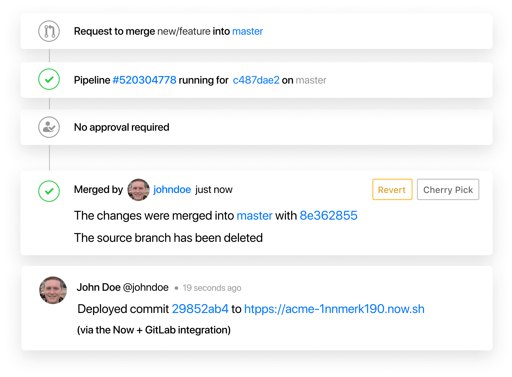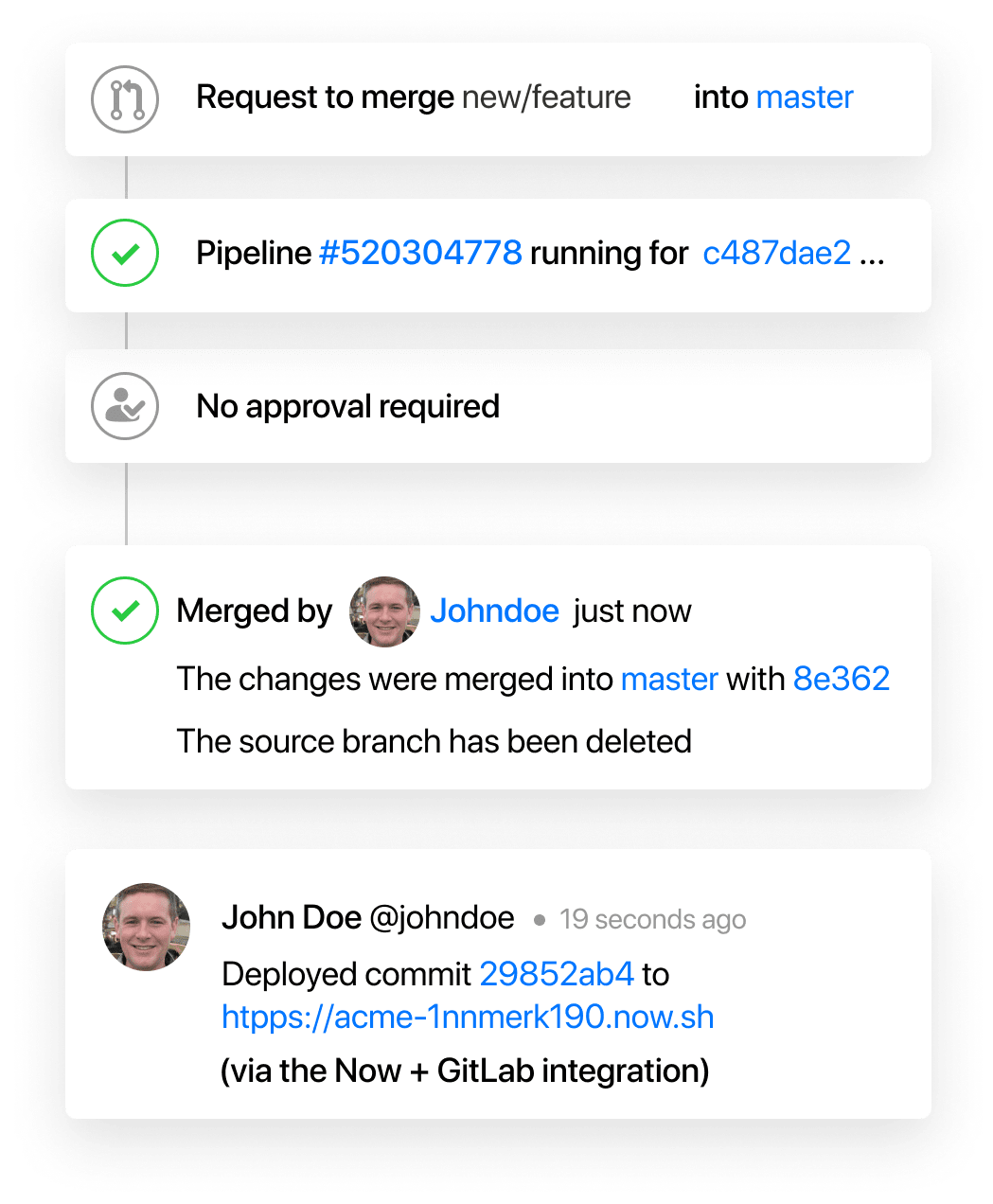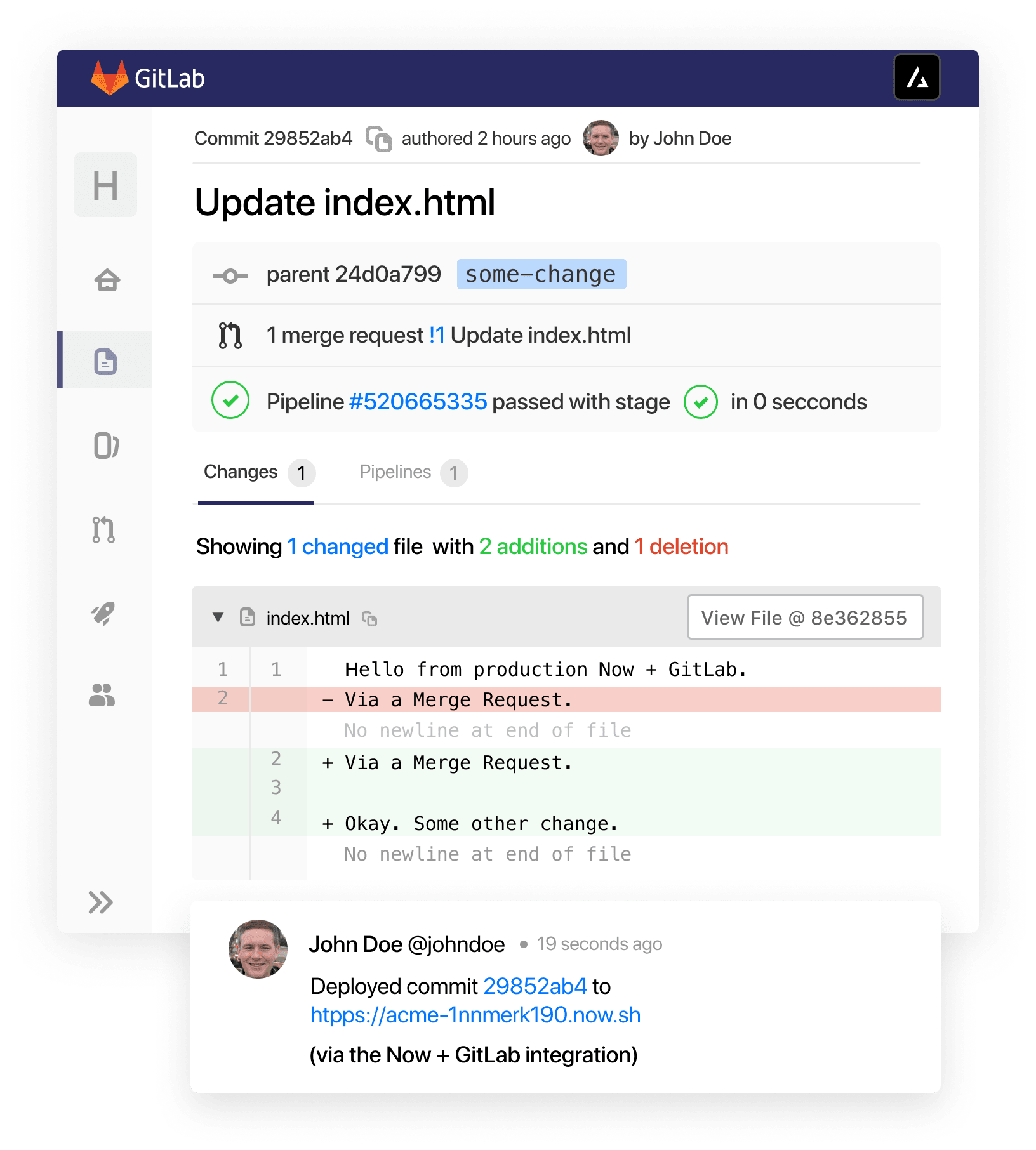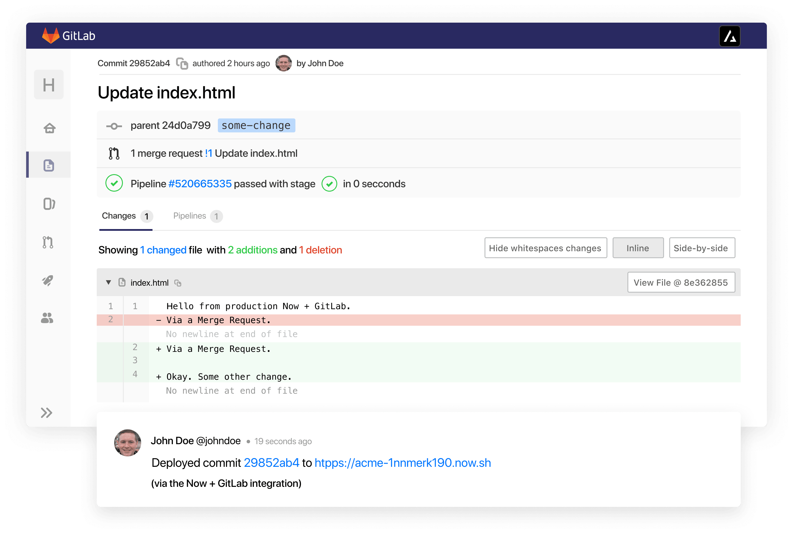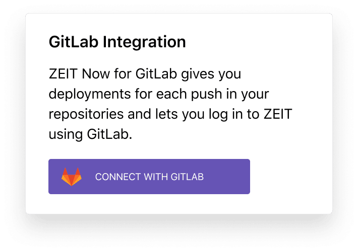 Set up our ZEIT Now for GitLab integration to deploy projects automatically from merge requests — zero configuration needed. Just push your code.